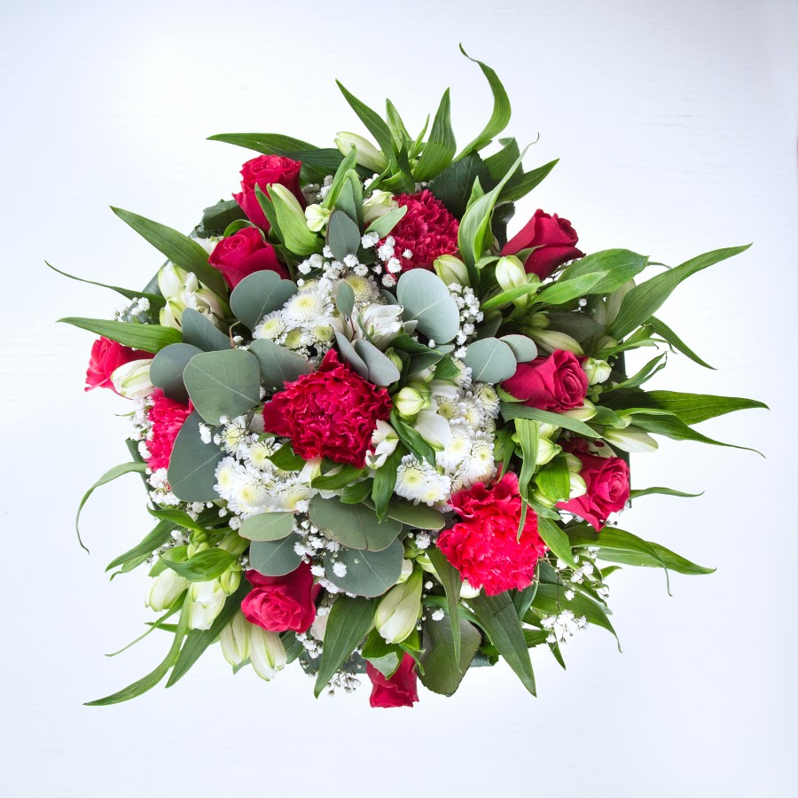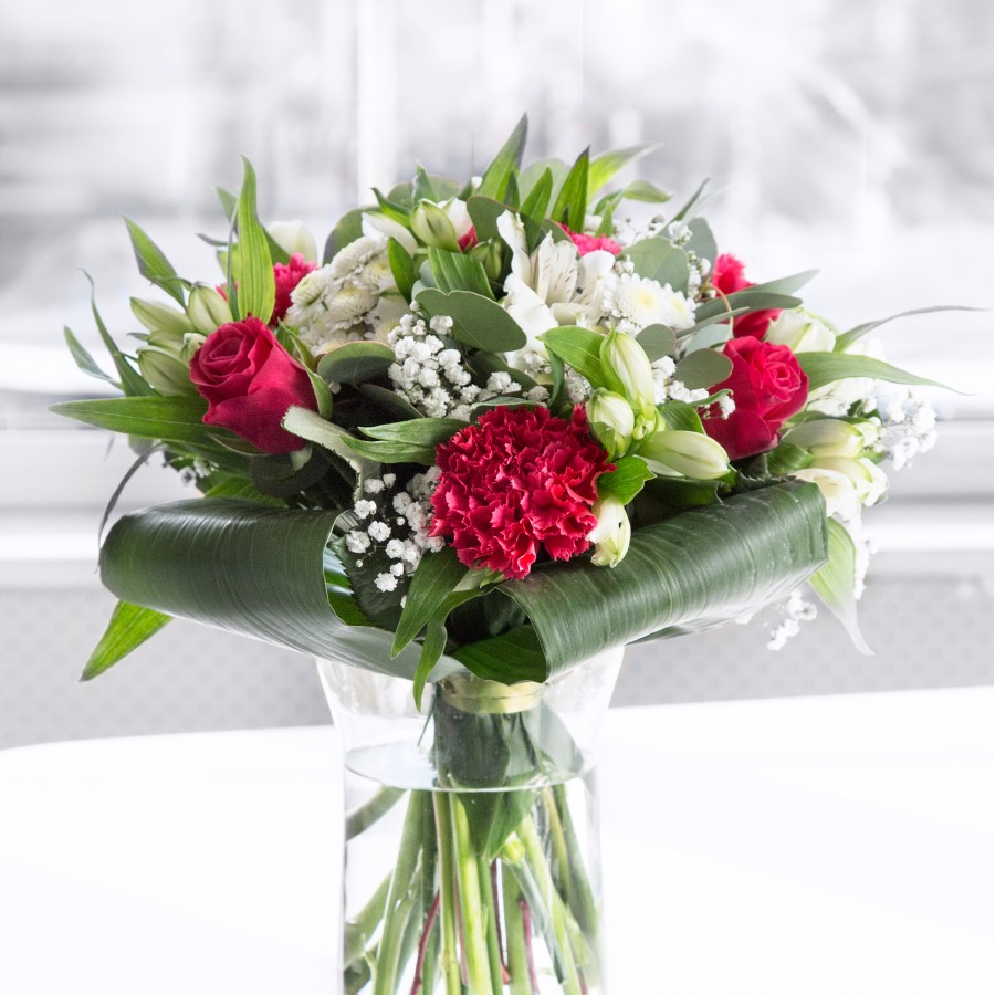 Experience the captivating beauty of our Elegant Blossom Bouquet. This arrangement showcases sweet white chrysanthemums and airy gypsophila, complemented by rich red roses and vibrant carnations. Enhanced with white alstroemeria and lush aspidistra leaves, every detail is meticulously crafted to create a stunning display.
