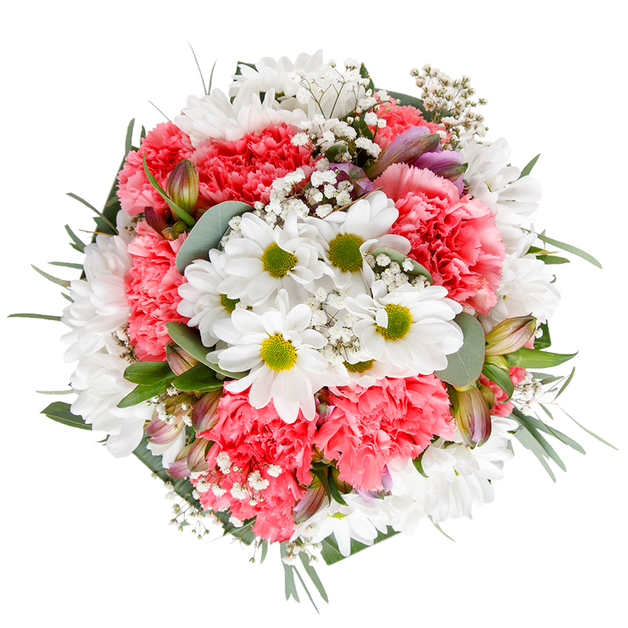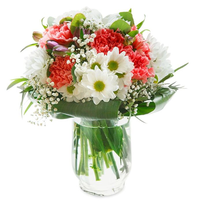 Show your appreciation with our perfect seasonal flower bouquet. This elegant arrangement features a stunning combination of white chrysanthemums, gypsophila, light pink carnations, and aspidistra leaves, thoughtfully designed to convey love and admiration.